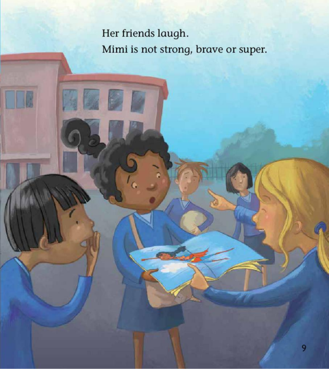 Mimi是一个热爱超级英雄系列漫画书的小学生,同时她将自己画成一个英雄人物去帮助弱小。当同学们看到她的画册时却一直嘲笑她,觉得她不够强壮、勇敢和强大。在一次火灾事故中,她通过自己的勇敢机智救了大家,赢得了大家的一致认同。通过故事让学生感受成为一个现实中的superhero应具备的特质。